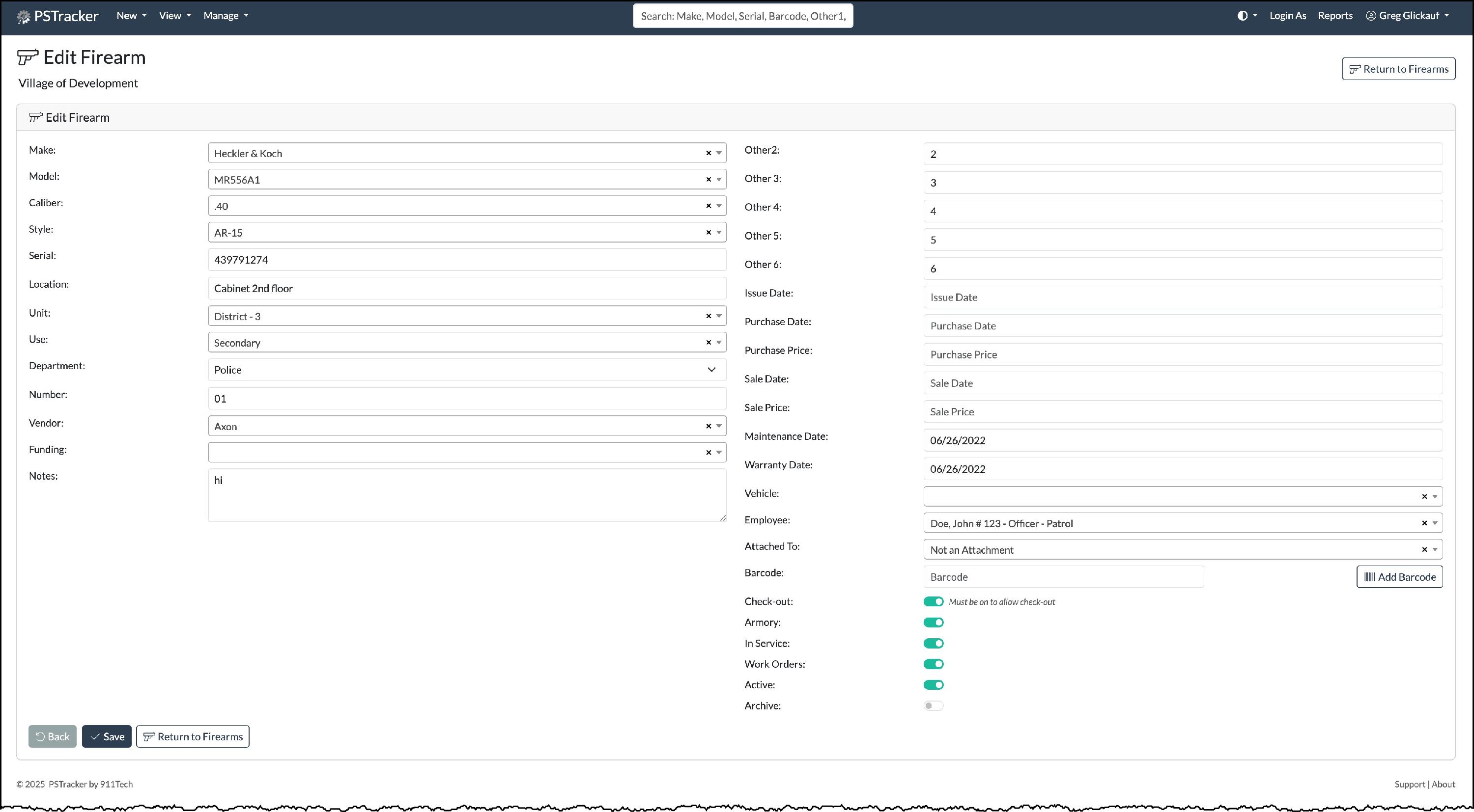 If your agency uses the check-in/out module, you can manage a firearm barcode from the Edit Firearm details page.