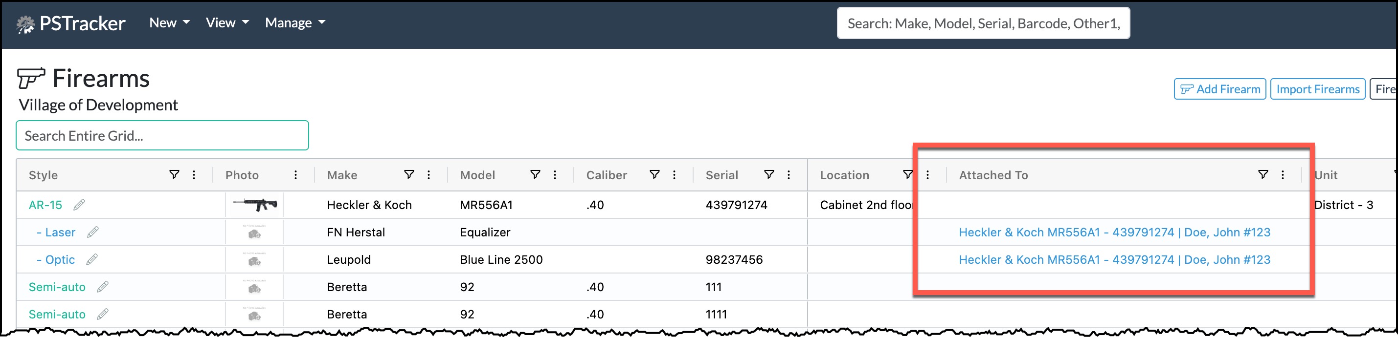 If you have Manager Permission, you can do this right on the main grid. Select the firearm using the Attached To column for the specific attachment(s). You can also associate it using the Edit page.