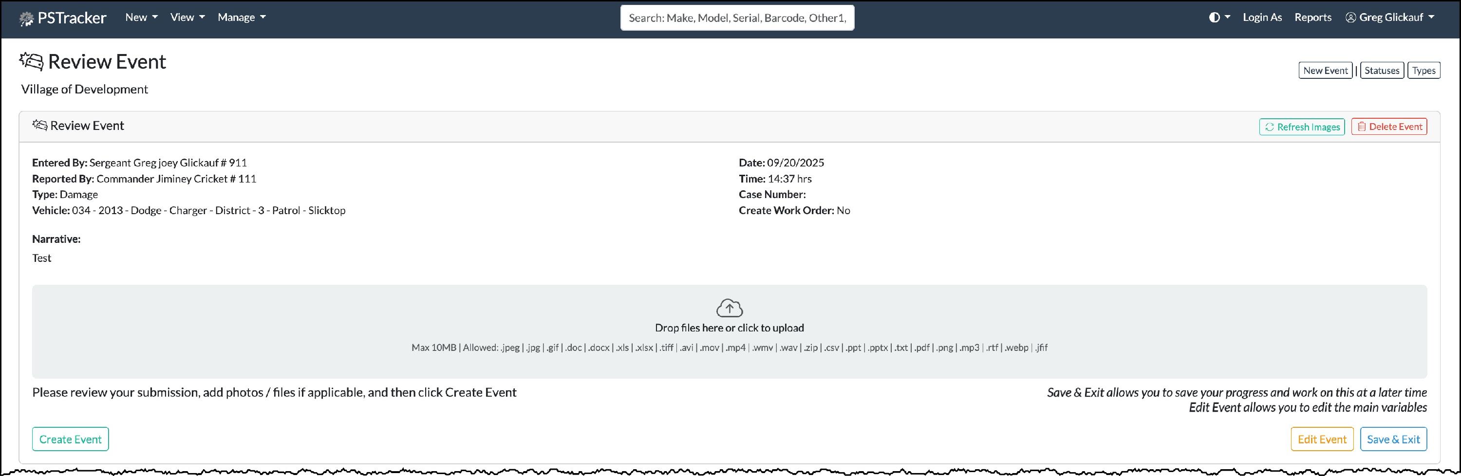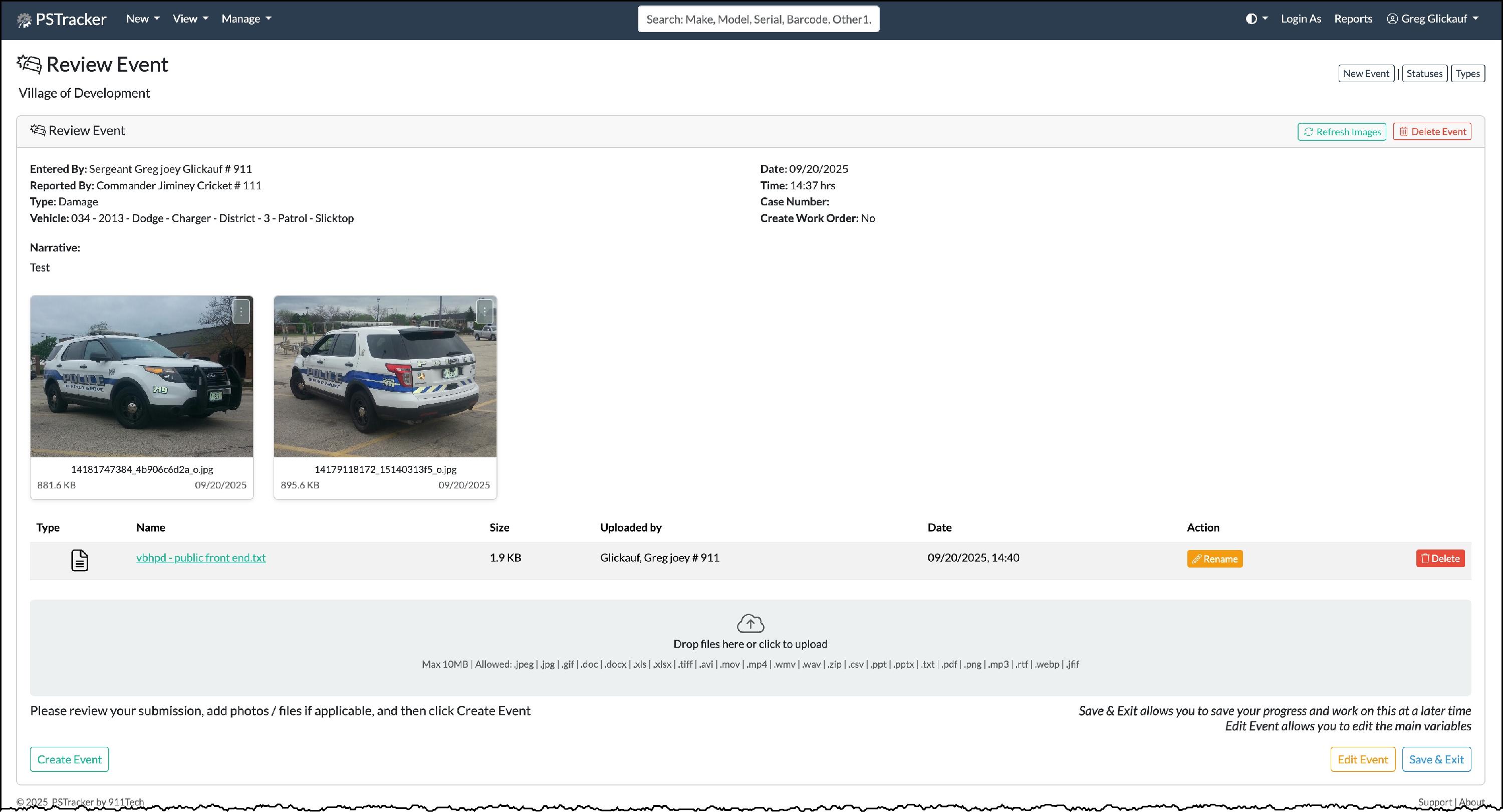 Events are designed to quickly and easily document and locate issues about a vehicle, such as scratches, dents, dings or damage.