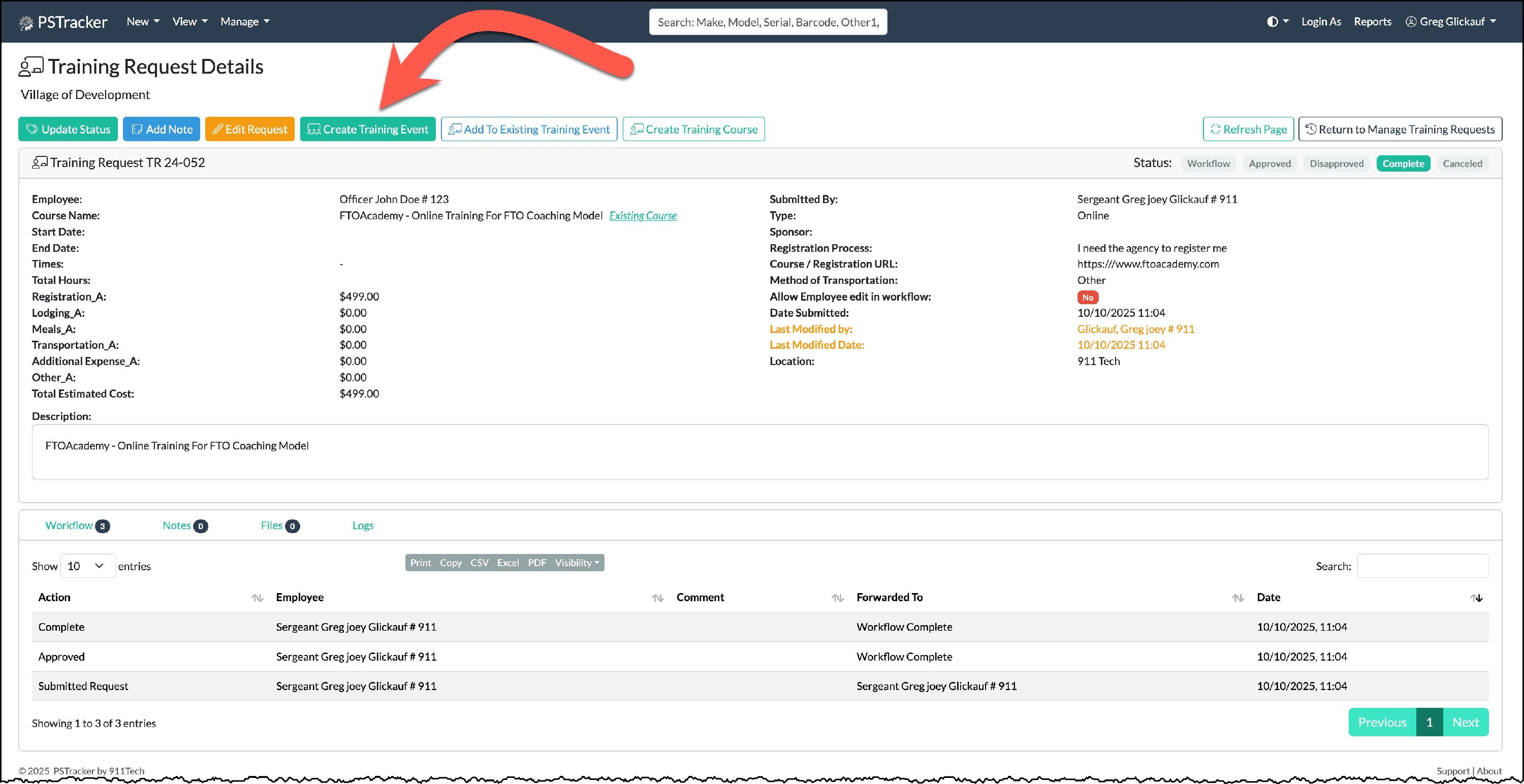 When a request is Completed, Create Training Event and Create Training Course buttons appear at the top of the request.