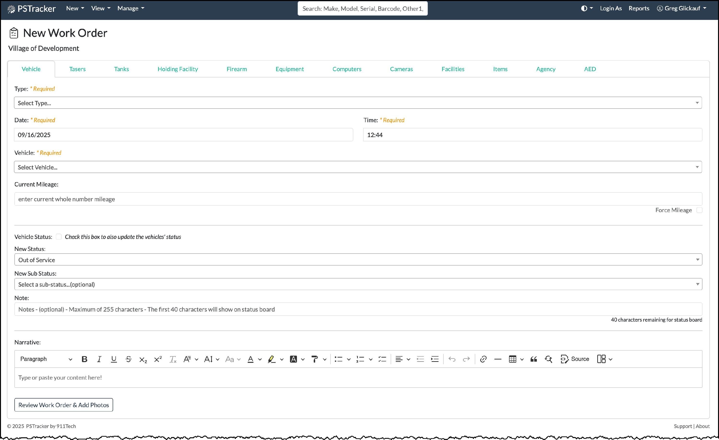 If you are creating a vehicle work order and your agency allows, you may also take a vehicle out of service form this screen.