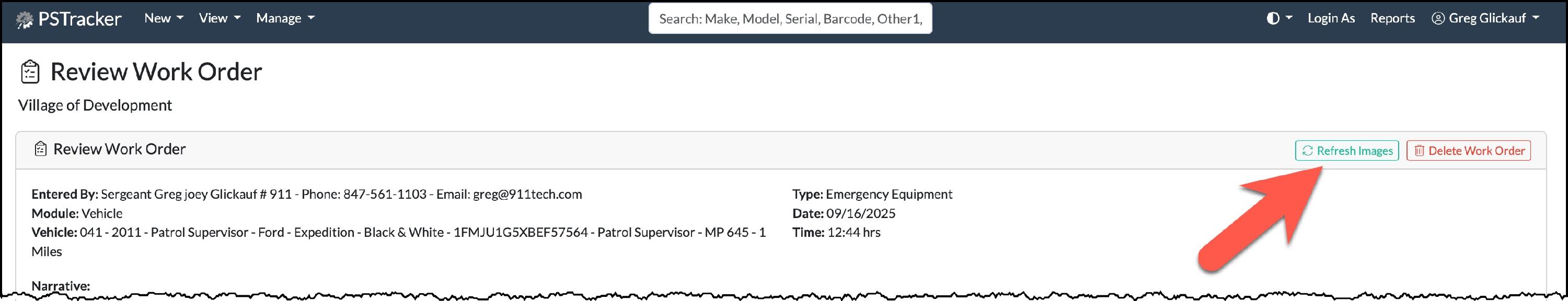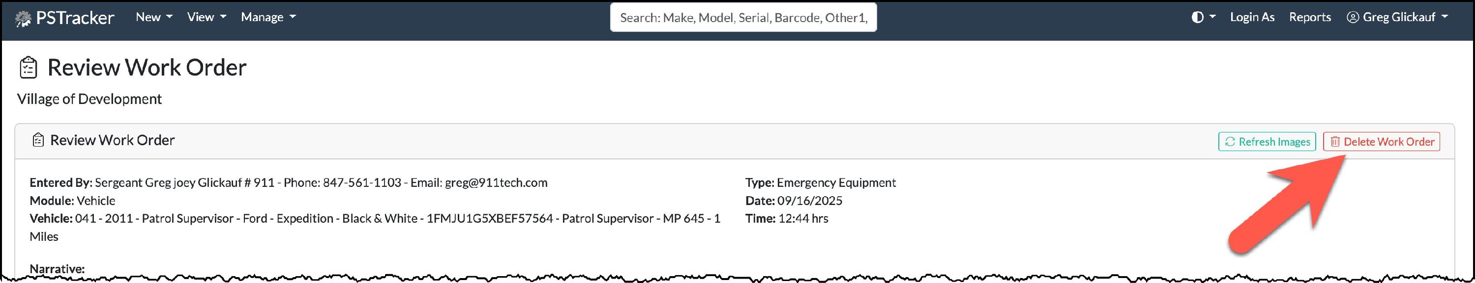 Work Orders should be created when you need to report an issues with an item tracked within PSTracker. To create a work order, click New => Work Order