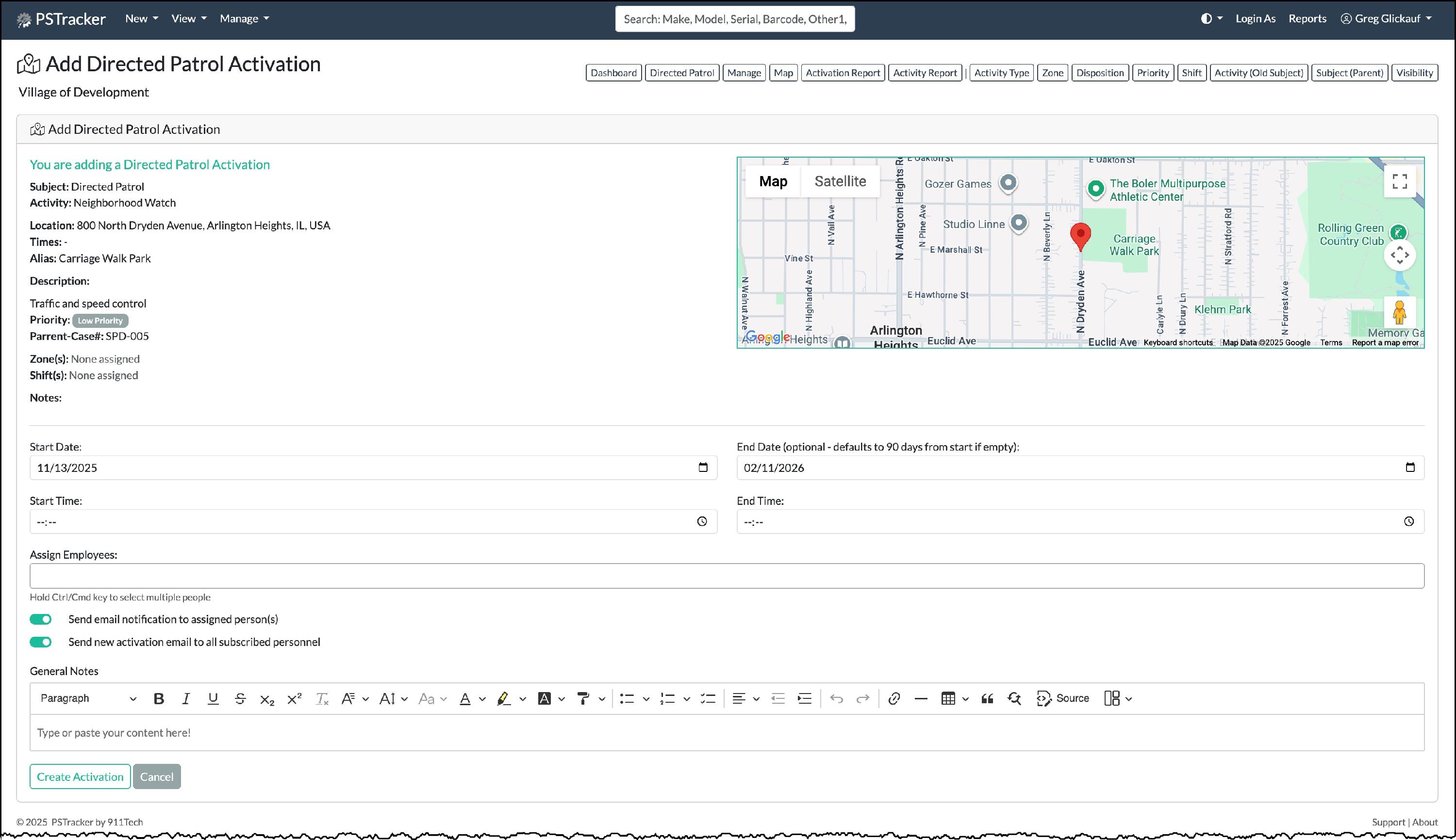 - General Notes can be used to provide details for this specific activation of the Directed Patrol.
