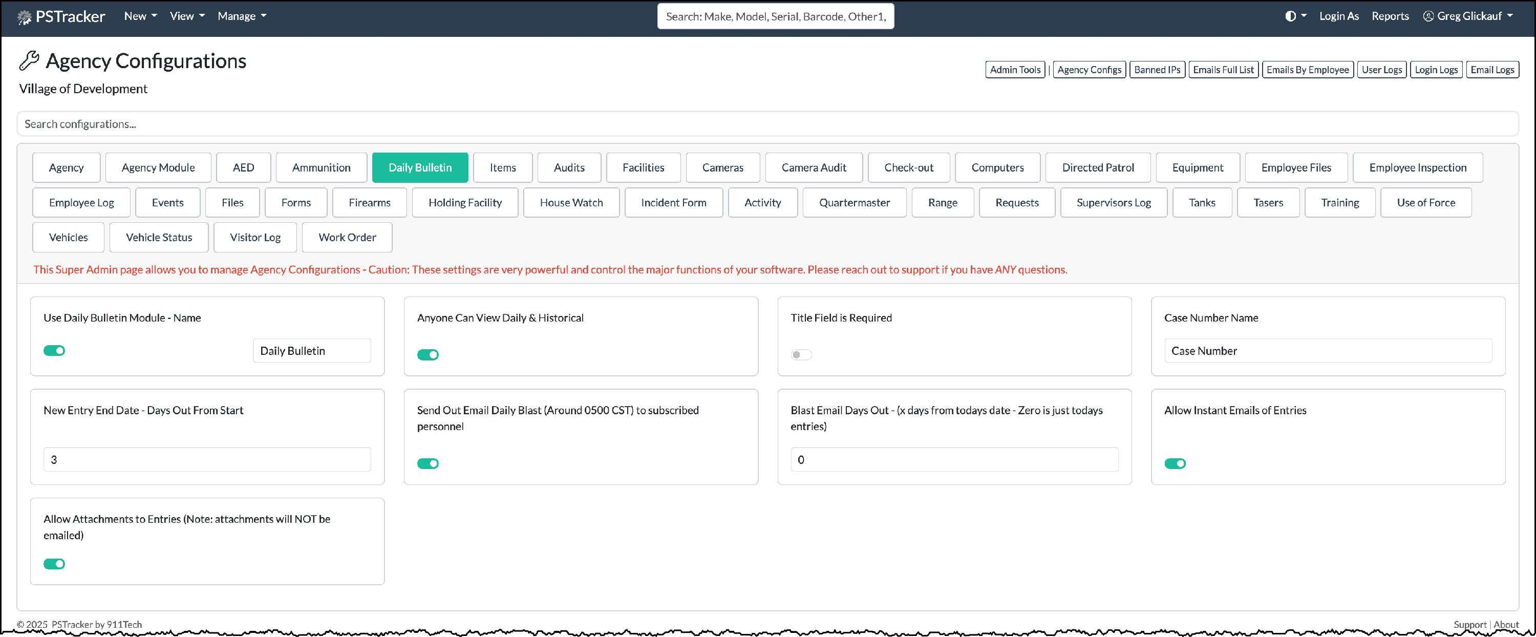 The Daily Bulletin Module is access able from the View Menu. The modules variables are managed from a permission based sub-menu and the configuration settings are managed on the Agency Configs => Daily Bulletin Tab.
